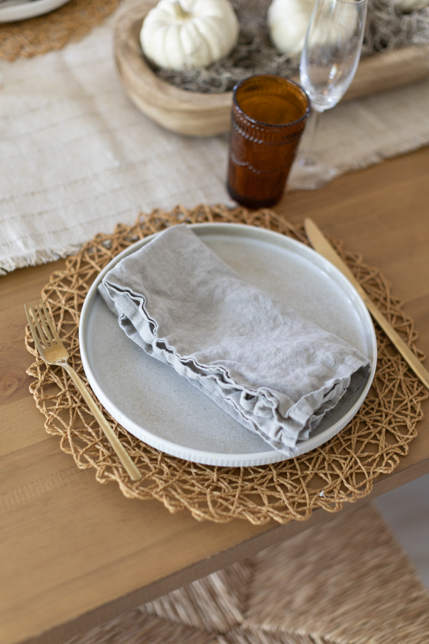 The key is layering. Start with a neutral table runner or linen base, then add natural accents like wood or rattan chargers, ceramic or stone looking plates, and soft linen napkins. Keep your color palette muted, like beige, soft grays, or sage green. Then, layer in subtle fall touches like a few neutral pumpkins (in muted tones), candle holders, and maybe a sprig of eucalyptus. It feels warm and seasonal without being overwhelming.