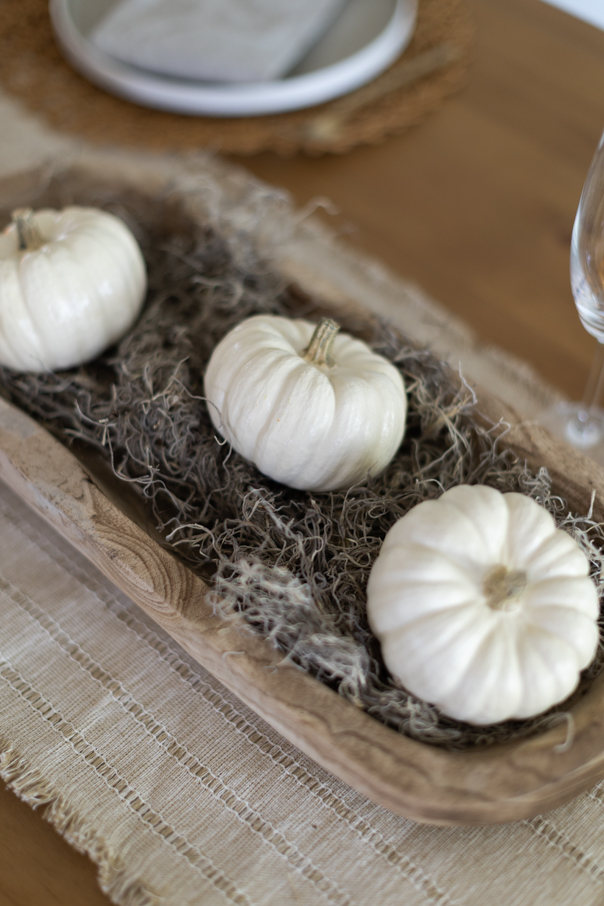 Especially here in Florida, where it’s still warm and sunny, bright orange pumpkins don’t always feel right. I lean toward softer accents, white and sage pumpkins, natural woods, and creamy neutral textiles. Simplicity is always best, and you don’t have to go crazy to create a beautiful autumn table that feels seasonal and sophisticated.